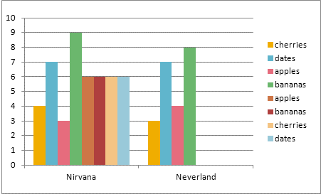 This simple table lists the fruit consumption in two different countries. Charted as a clustered column chart, it may look like this, after a bit of formatting and adjusting colours to something digestible: