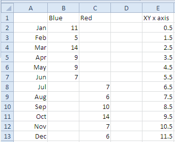 Add the populated cells from column C as a new series with X values from column E, i.e.