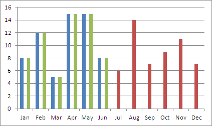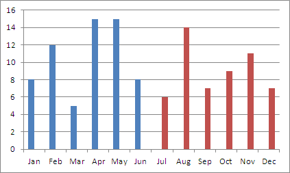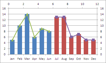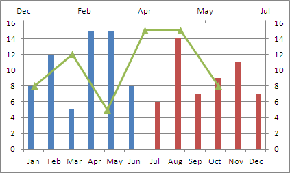 Adjust the maximum value of the secondary X axis. The maximum value needs to be identical with the number of columns in the chart. In this example, the chart has 12 columns, so the maximum value for the secondary X axis needs to be set to 12.