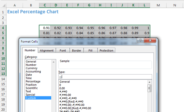 The cells now feature a faint grey grid, but the numbers are still showing. Here’s how to hide them for good: Keep the 100 cells selected, open the Format Cells dialog again and activate the Number tab. Choose the Custom option from the number categories and in the Type field enter three semicolons