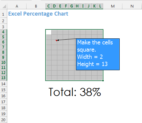 Select columns C to L and use the Format drop-down on the Home ribbon, where you will find the Width command. Then select rows 4 to 13 and use the same dropdown to select the Height.