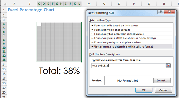 Last week I saw some amazing Excel spreadsheets while I was attending the MVP Summit in Seattle and I thought I’d share some ideas. So here are step by step instructions on how to create a percentage chart with just the Excel grid and a sprinkle of conditional formatting. The goal we’re after looks like this: