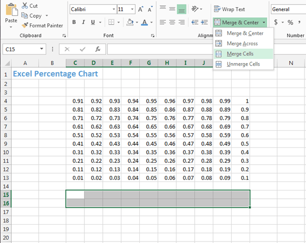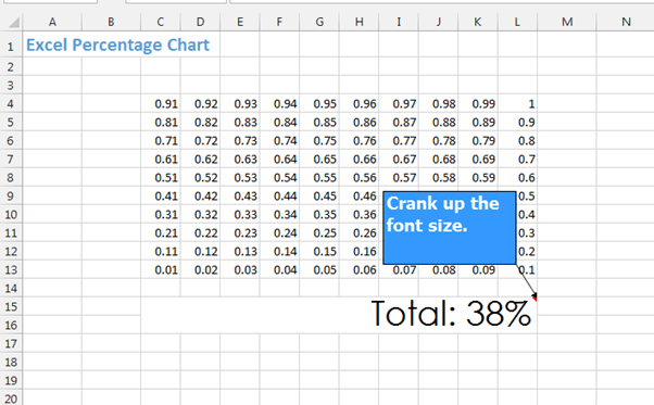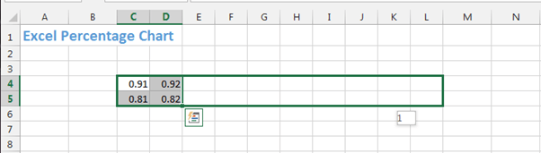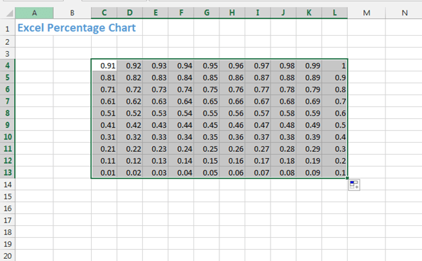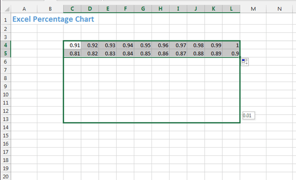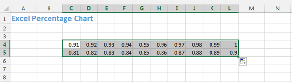 First we need the numbers from 0.01 to 1.00 in steps of 0.01 in a grid of 10 by ten cells. If you want, you can type these 100 numbers in manually, but there’s a faster way if you use the fill handle (the little dark square at the lower right corner of the active cell). We only need to type in four numbers. Let’s start in cell C4 and enter 0.91, then manually enter 0.92 in D4. Cells C5 and D5 will get the numbers 0.81 and 0.82 respectively.
