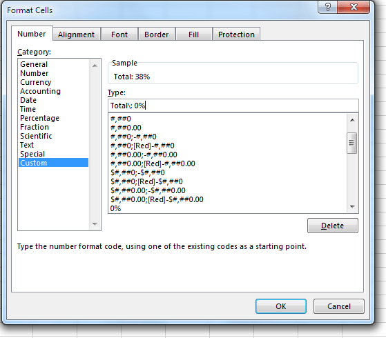 After merging the cells, let’s enter a number, say 38% and do some number formatting. I’d like the cell to show the text “Total:” as well as the percentage number. Click the lower right corner of the Number group on the Home ribbon to open the Format Cell dialog. In the left hand pane select Custom at the bottom of the list. In the Type field enter the text